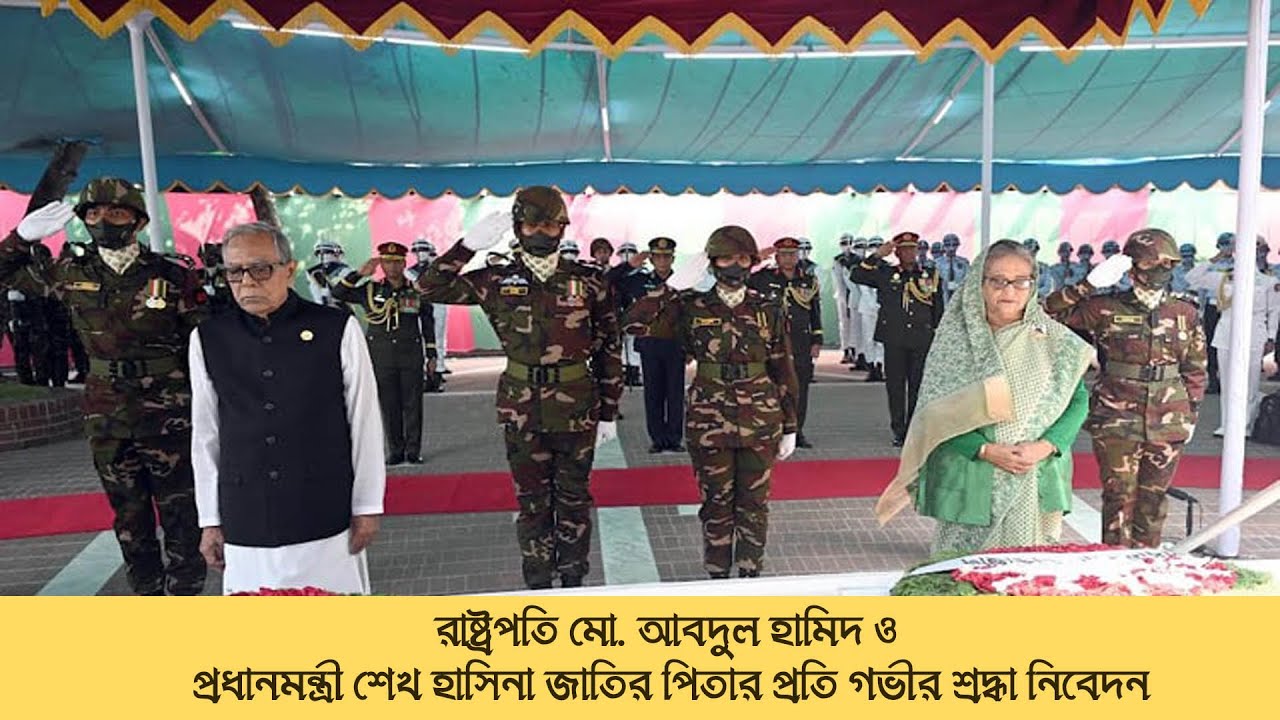 রাষ্ট্রপতি মো. আবদুল হামিদ ও প্রধানমন্ত্রী শেখ হাসিনা জাতির পিতা বঙ্গবন্ধু শেখ মুজিবুর রহমানের ১০৩ তম জন্মবার্ষিকী ও ‘জাতীয় শিশু দিবস’-২০২৩-উপলক্ষে জাতির পিতার প্রতি গভীর শ্রদ্ধা নিবেদন করেছেন। রাষ্ট্রপতি ও প্রধানমন্ত্রী সশরীরে উপস্থিত থেকে আজ সকাল সাড়ে দশটায় গোপালগঞ্জের টুঙ্গিপাড়ায় বঙ্গবন্ধুর সমাধিতে পুষ্পস্তবক অর্পণ করে শ্রদ্ধা জানান। প্রথমে রাষ্ট্রপতি হামিদ বঙ্গবন্ধুর মাজারে পুষ্পস্তবক অর্পণ করেন এবং এর পর পরই প্রধানমন্ত্রী শেখ হাসিনা পুষ্পস্তবক অর্পণ করেন। পুষ্পস্তবক অর্পণের পর তাঁরা জাতির পিতা বঙ্গবন্ধুর স্মৃতির প্রতি গভীর শ্রদ্ধা জানিয়ে সেখানে কিছুক্ষণ নীরবে দাঁড়িয়ে থাকেন। বাংলাদেশ সেনাবাহিনী, নৌ ও বিমান বাহিনীর একটি সুসজ্জিত চৌকস দল গার্ড অব অনার প্রদান করে। আওয়ামী লীগ সভাপতি শেখ হাসিনা দলীয় সিনিয়র